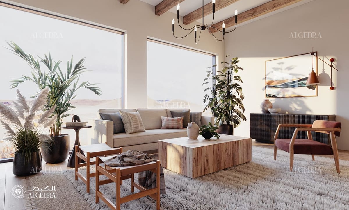 يتم استخدام الجلد الطبيعي والجلد المدبوغ والمواد الطبيعية الأخرى بشكل بارز. حيث تبرز قطع الأثاث الكبيرة لوحة الصدأ والطين وخضرة الصبار السائدة بالفعل مع استخدام المواد الطبيعية والباستيل المستوحى من غروب الشمس ، والذي يذكّرنا بالصحراء ، ينضح هذا التصميم بجماليات ساحرة من العالم القديم.