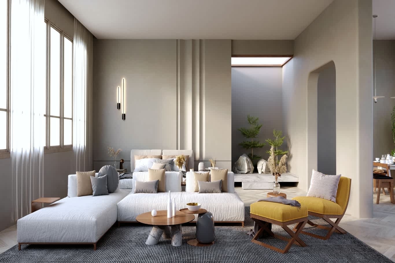 أرائك منحنية، طاولات قهوة حجرية، تخزين مدمج، ومقاعد ضيوف مرنة.