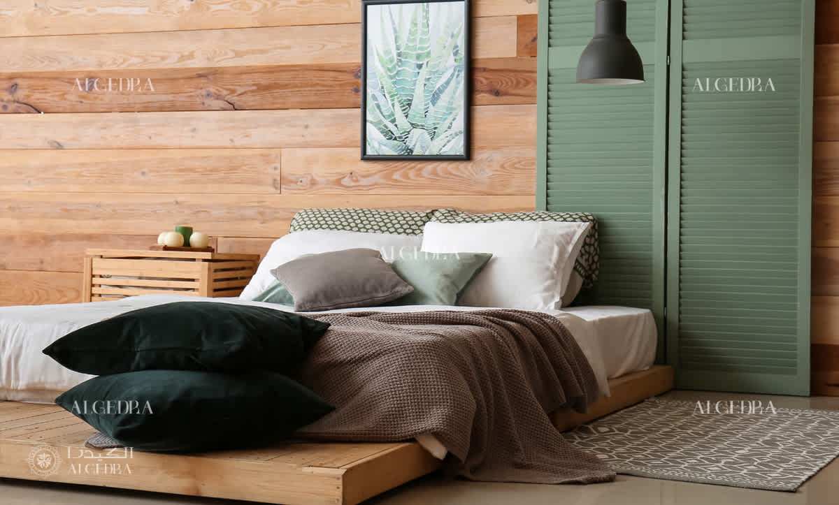 أضف لمسة من الأناقة إلى غرفة نومك من خلال استخدام اللوح الأمامي الخشبي أو المنضدة الخشبية.