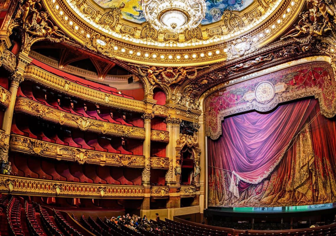 قصر غارنييه هو مسرح ذو حالة استثنائية من الثراء والفخامة، ويتسع لحوالي 2200 شخص من المشاهدين تحت ظل ثريا مركزية ضخمة تزن أكثر من ستة أطنان، وتتسع منصة المسرح لاستيعاب 450 فنان.