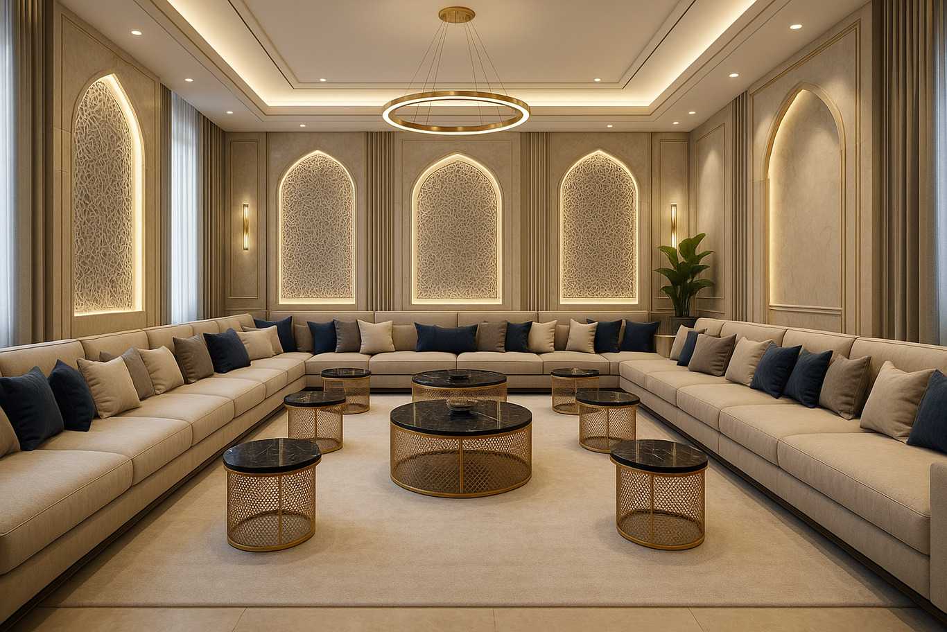 توازن المجالس العربية العصرية بين التقاليد والراحة. ترتيبات الجلوس المدروسة، اختيار المواد، الأنماط، الإضاءة، والديكور تخلق مساحات مرحبة للحوار والتجمعات الاجتماعية.