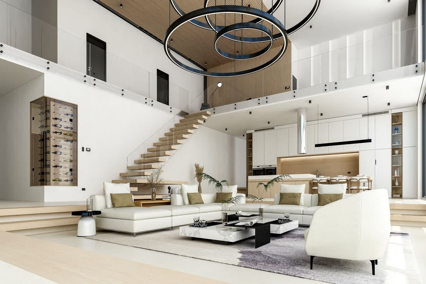 تصميم مفتوح يضم المعيشة والطعام والمطبخ في مساحة واحدة دون فواصل، يعزز التفاعل والراحة.