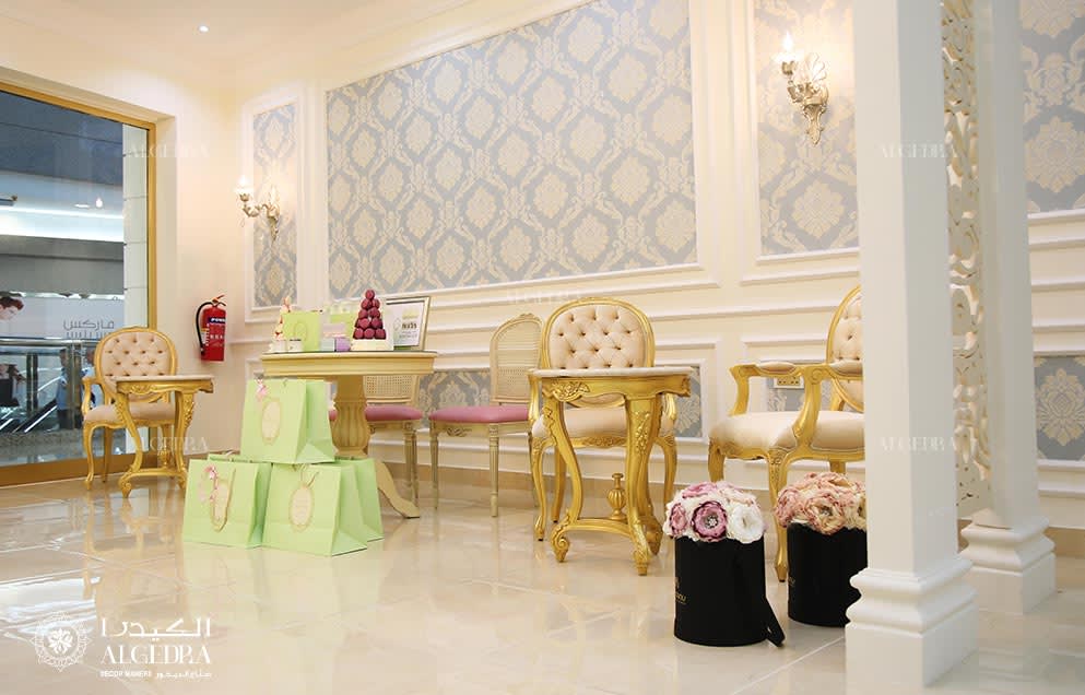 طاولة كلاسيكية في المنتصف بزخارف ذهبية يدوية قمنا بتجهيزها أيضاً لعرض المحتويات المميزة , وضعنا ثريا بلون ذهبي لتخلق الانسجام والروح الواحدة في المتجر, استخدمنا الرخام في الأرضية بلون الكراميل, واستخدمنا ورق جدران ذو نقوش ذهبية وخلفية باللون الأزرق الفاتح لتتناسب مع ديكور المتجر, كما أن للفواصل التي قام فريقنا بإضافتها لمستها الجمالية على المكان خاصة وأن نمط المفروشات الكلاسيكي الذي قمنا بإضافته تناسق معها ومع المحيط العام للمكان فجمع ما بين بساطة الديكور الكلاسيكي وجمال الفن الفيكتوري في تفاصيله ولونه الذهي الذي ظهر جلياً على الأثاث.