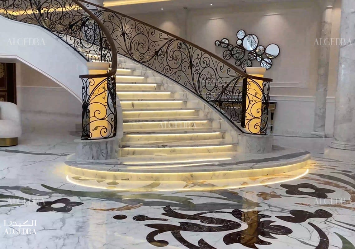 The palace's white marble with beige lines flooring features waterjet-cut embellishments, and it appeals to sophisticated taste and perception by invoking notions of luxurious living and wealth in this palace design.
