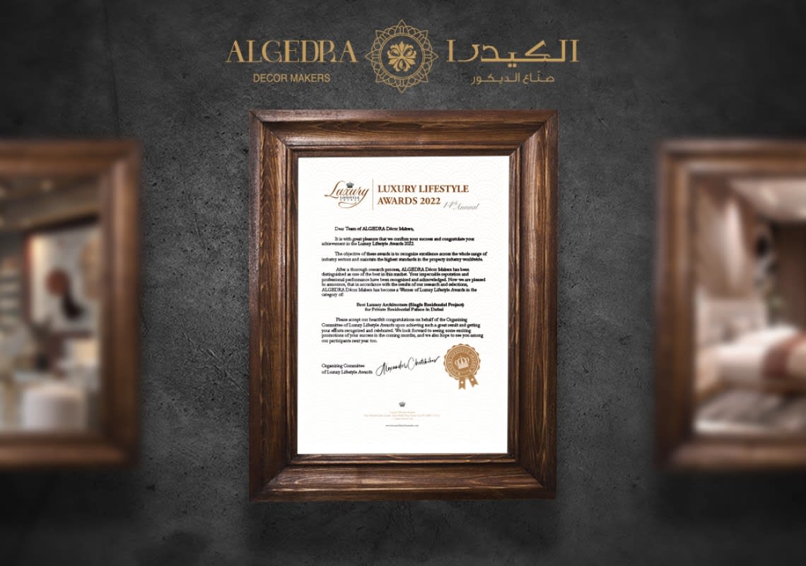 “After a thorough research process, Algedra Decor Makers has been distinguished as one of the best in this market. Your impeccable reputation and professional performance have been recognized and acknowledged. Now we are pleased to announce, that in accordance with the results of our research and selections, Algedra Decor Makers has become a winner of the Luxury Lifestyle Awards in the category of BEST LUXURY ARCHITECTURE (SINGLE RESIDENTIAL PROJECT) FOR PRIVATE RESIDENTIAL PALACE IN DUBAI” - Organizing Committee of Luxury Lifestyle Awards.