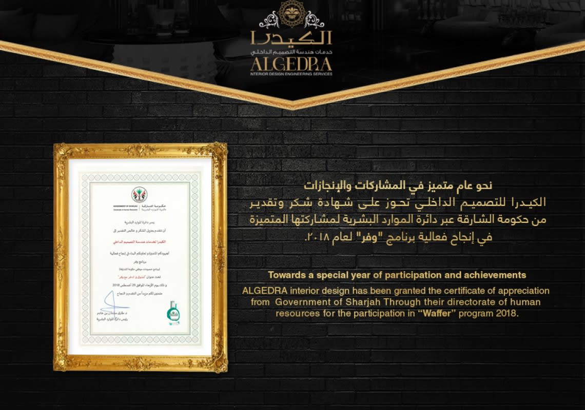 ALGEDRA interior design has been granted the certificate of appreciation from Government of Sharjah
